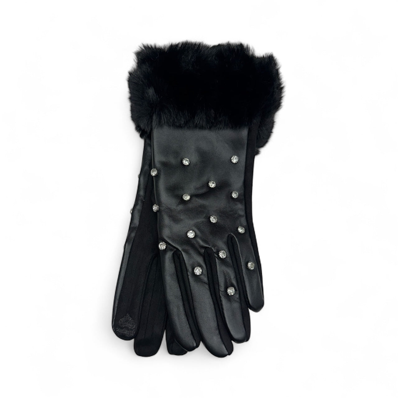 Faux Leather Rhinestone Gloves with Fur Cuff
